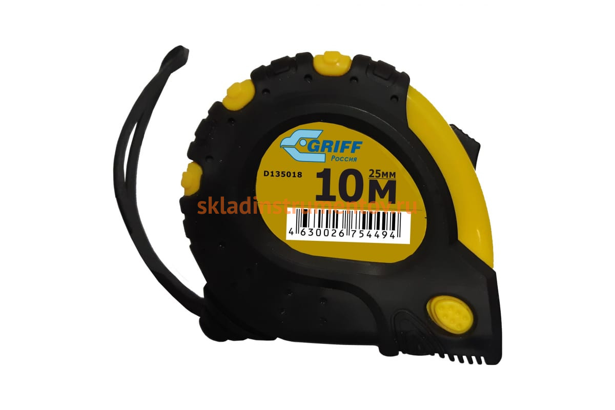 Рулетка 10мх25мм с 3 фиксаторами, в обрезиненном корпусе GRIFF d135018 - надежный измерительный инструмент. За счет большой ширины ленты и изгиба полотна нет переломов даже на большом плече.