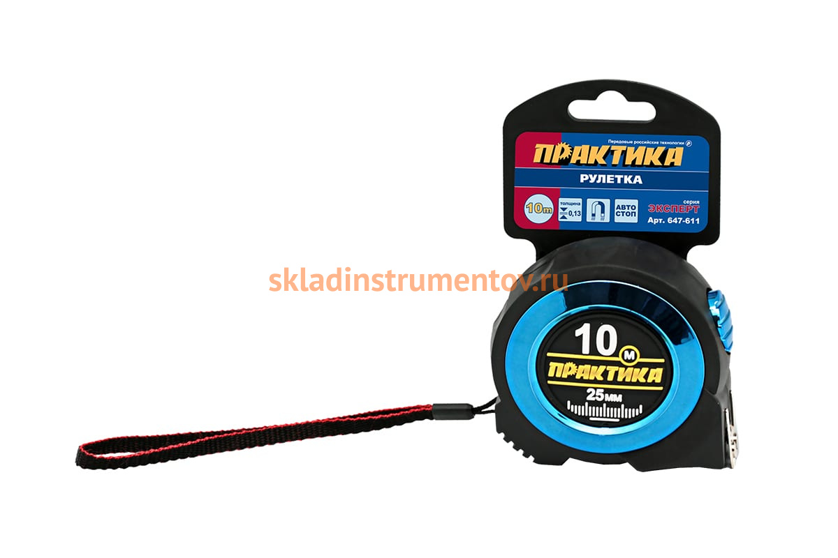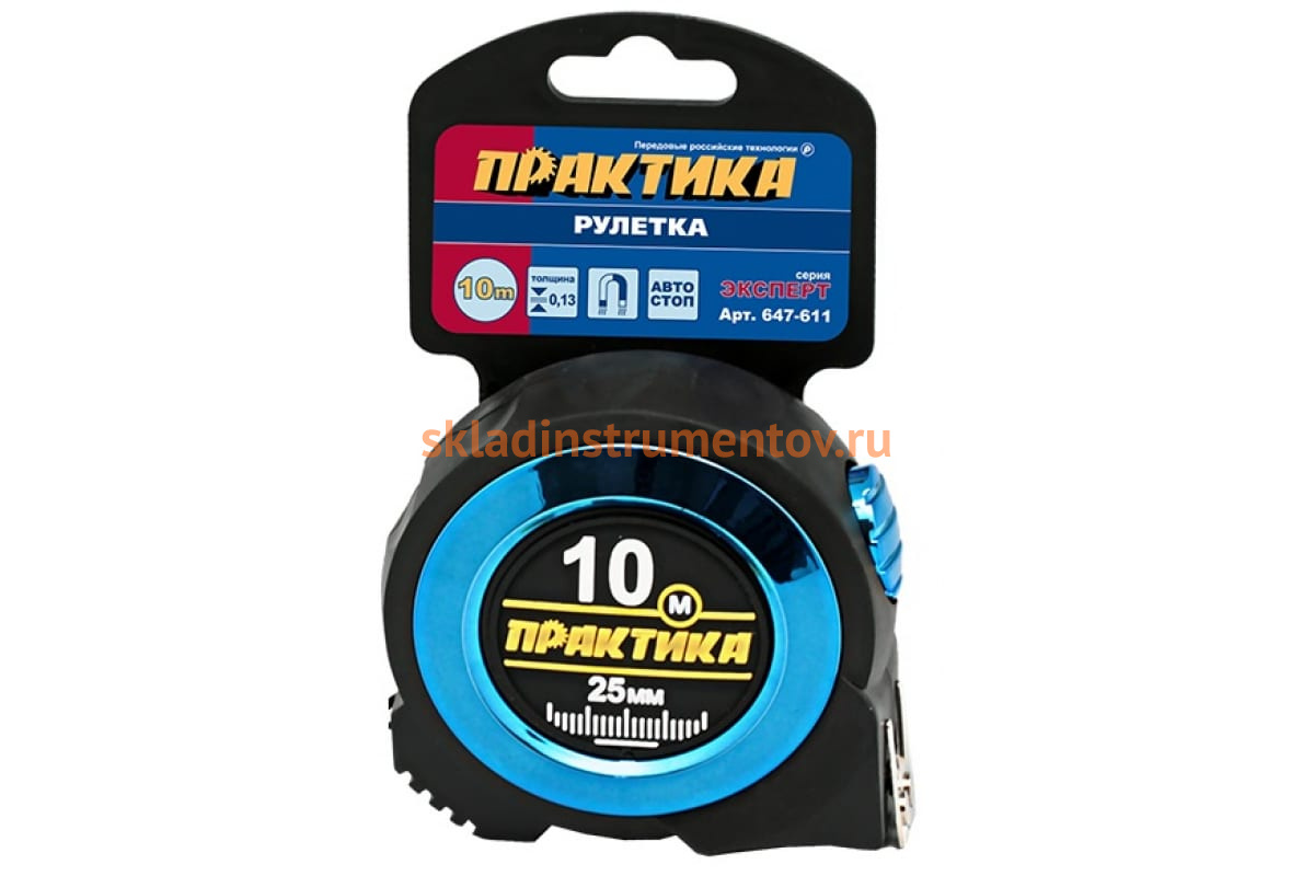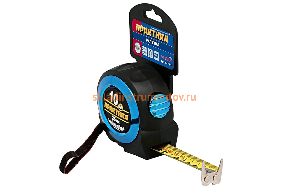 Рулетка ПРАКТИКА 10 м 647-611 - это измерительный инструмент, который обладает длинной стальной лентой с нейлоновым покрытием и двухсторонней шкалой. Лента располагается в обрезиненном металлическом корпусе. Магнитный крючок облегчает работу. Для фиксации ленты в нужном положении на корпусе расположен автостоп. Размер - 25 мм х 10 м.