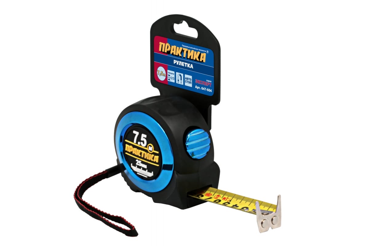 Рулетка ПРАКТИКА 7,5 м 647-604 представляет собой изделие для проведения измерений. Стальная лента длиной 7.5 метров имеет нейлоновое покрытием. Металлический обрезиненный корпус обеспечивает защиту в случае падения. Рулетка оснащена автостопом и магнитом. Ширина ленты - 25 мм.