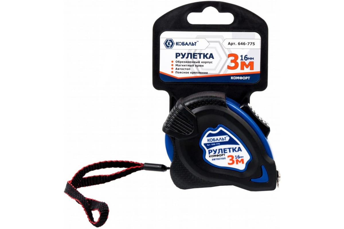 Рулетка Комфорт (3м x 16мм) обрезиненный корпус КОБАЛЬТ 646-775 удобна в использовании. Форма корпуса рулетки позволяет крепко и удобно держать её в руке. Изделие оснащено крюком True Zero с магнитом и прочным капроновым ремешком. Автостоп позволяет остановить ленту в любой момент.