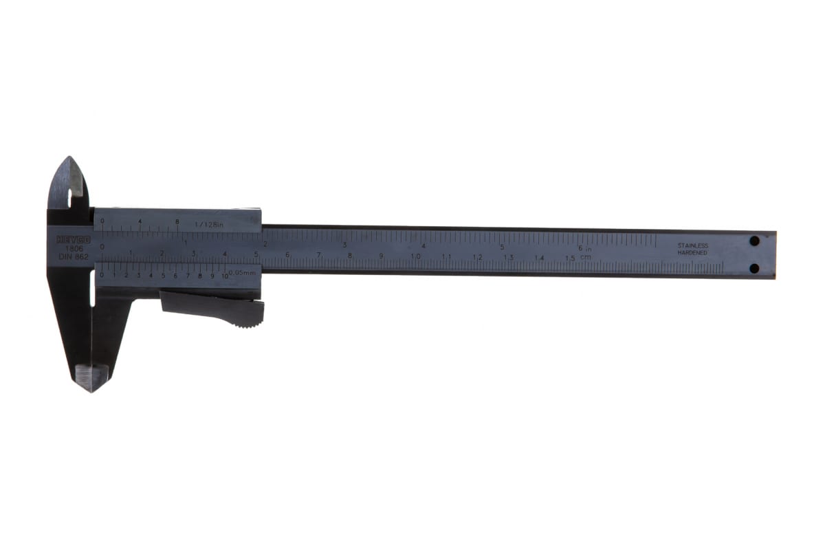Штангенциркуль HEYCO HE-01806015080 применяется для выполнения высокоточных измерений. Используется преимущественно в мастерских. Корпус изготовлен из нержавеющей стали, а для длительного хранения инструмент поставляется в кожаном футляре. Нониус 1/20 MM служит для более точного определения количества долей делений. На обратной стороне нанесена таблица типов резьбы.