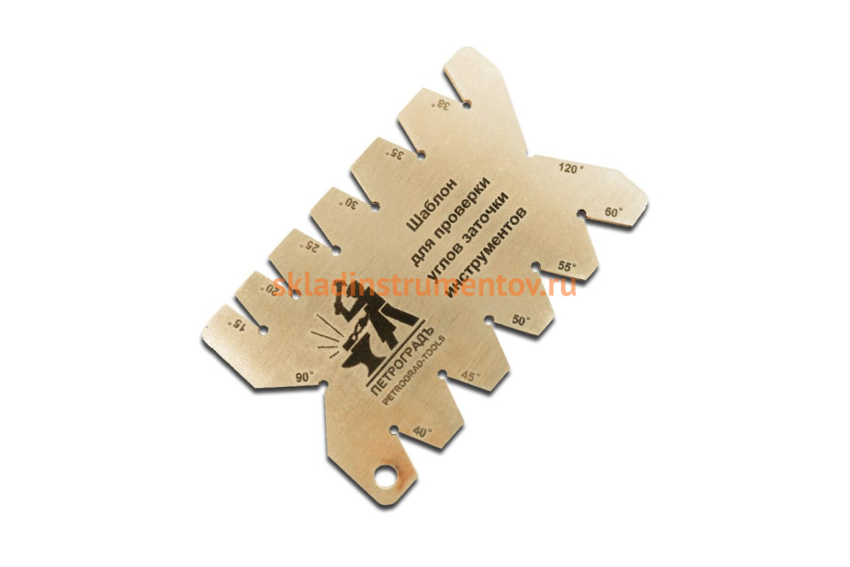 Угломер для проверки углов заточки инструментов ПЕТРОГРАДЪ 85мм х55мм М00016605 используется для проверки углов при заточке стамесок, резцов, ножей рубанков и другого режущего инструмента. Имеет 13 вырезов под углы - 15°, 20°,22.5° 25°, 27.5°, 30°, 32.5°, 35°, 37.5°, 40°, 45°, 90°, 120°.