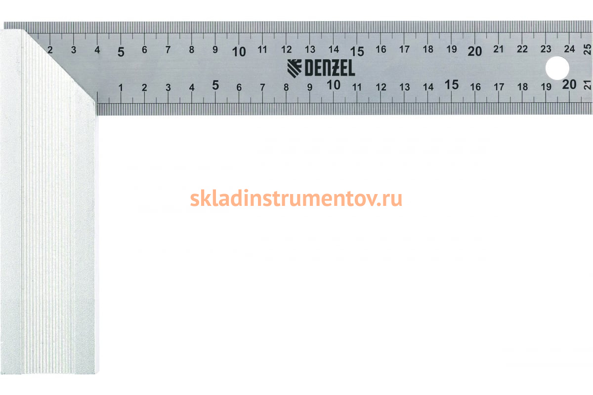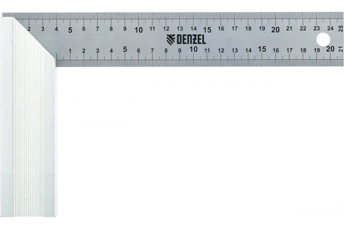 Угольник Denzel нержавеющая сталь, градуировка, алюминиевое основание, 250 мм 32396 имеет двухстороннюю разметку. Идеально подходит для проверки прямых углов, а также углов в 45 градусов.