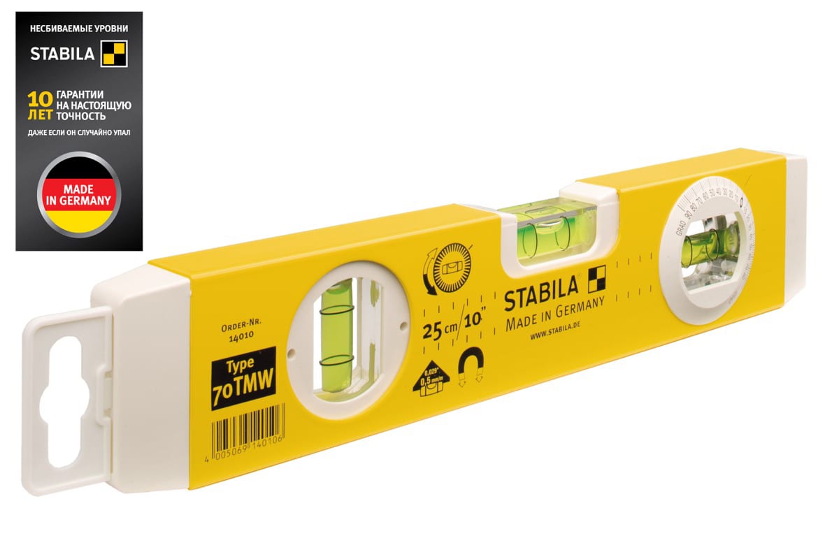 Магнитный уровень с угломером тип 70TМW STABILA 14010 укомплектован тремя ампулами. Магнитное основание облегчает крепление и проведение выверки на металлических конструкциях. Изделие применяется при строительных работах, когда необходимо измерить угол и наклон поверхностей. Длина инструмента всего 25 см, что способствует работе в стесненных условиях.