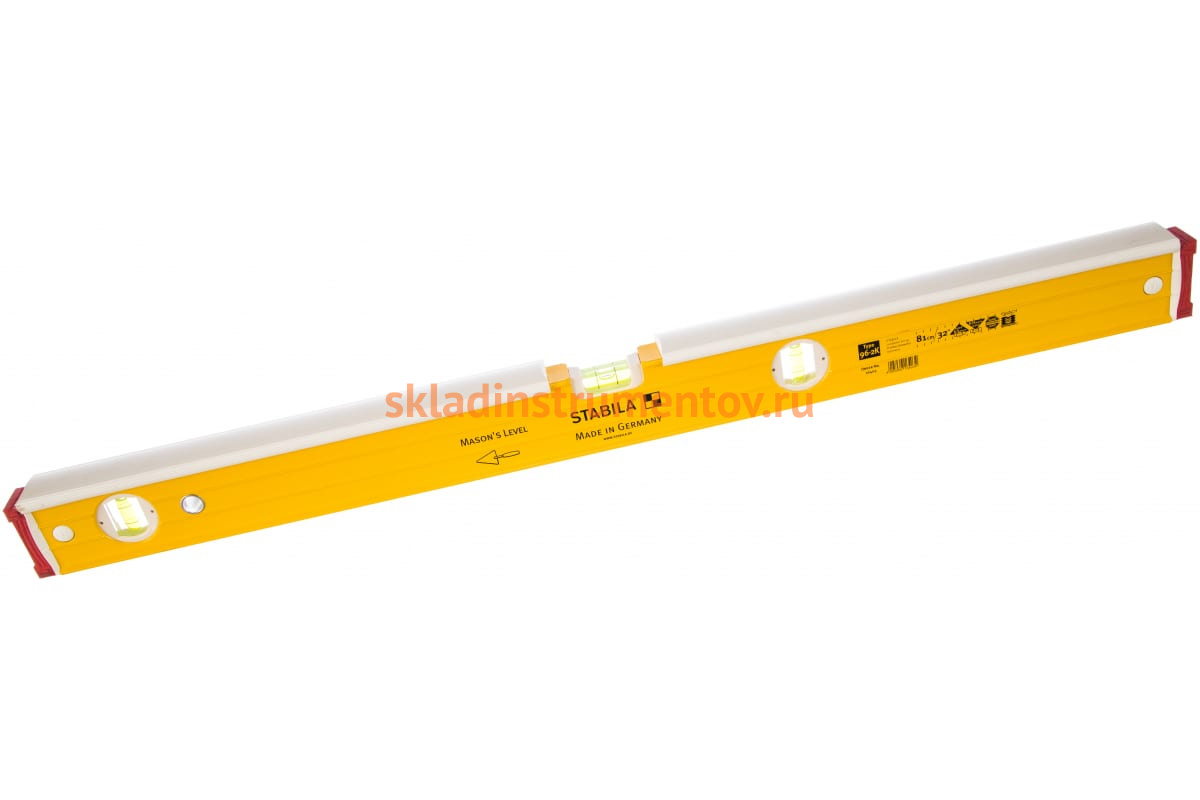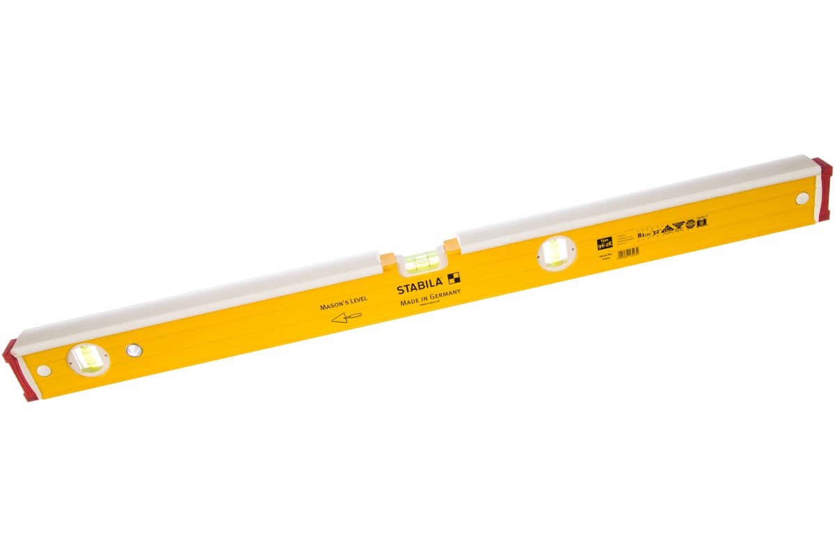 Уровень для каменщика/плиточника STABILA тип 96-2 К 80 см 16403 используется во время проведения строительно-укладочных работ. Изделие с небольшой погрешностью в 0.029 градуса определяет отклонение поверхности. Уровень имеет стабильный прямоугольный профиль, специальный ватерпас для каменщика, три глазка и съемные колпачки. Благодаря защите против ударов коррекцию отклонений можно производить при помощи кельмы, постукивая по уровню.