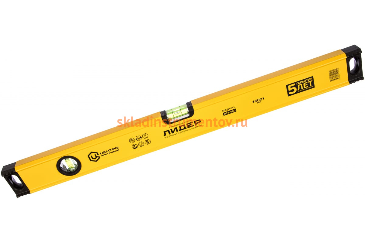 Уровень 600 мм Центроинструмент Лидер Л16-600 оснащен двумя полиакриловыми колбами. Инструмент позволяет определить отклонение от горизонтальной или вертикальной оси, а также прямоту поверхности. Изделие выполнено из прочного профиля с дополнительными ребрами жесткости. Погрешность измерений не превышает 0.75 мм/м.