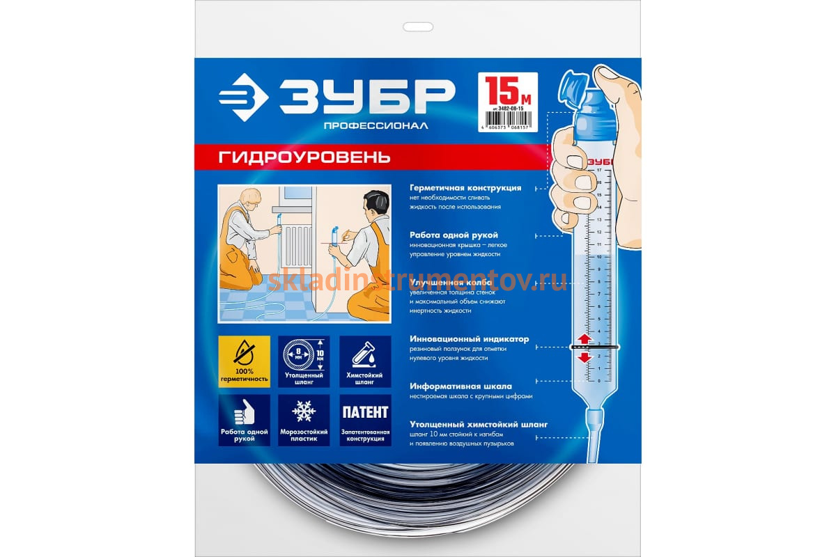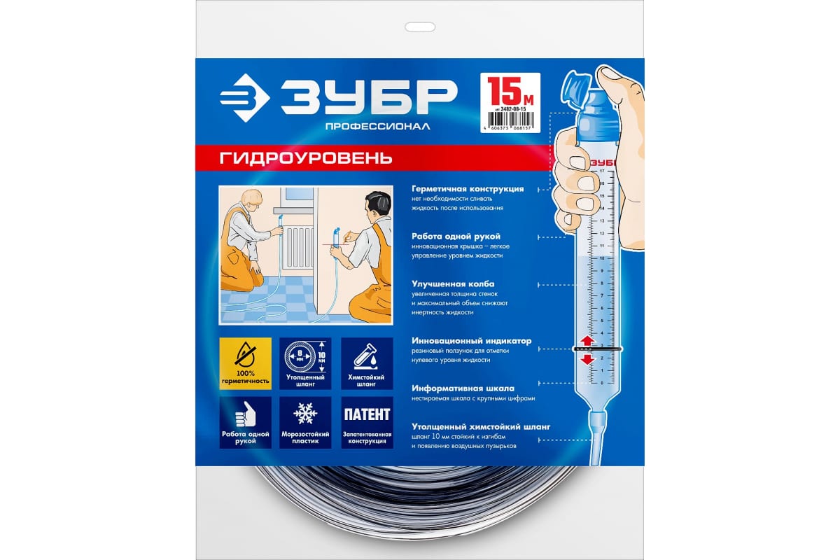Строительный гидроуровень ЗУБР Профессионал 15 м 3482-08-15 - доступный и полезный измерительный инструмент для профессионального применения. Работает по принципу сообщающихся сосудов. Помогает выровнять поверхностные элементы строительной конструкции - кирпичная кладка, фундамент, относительно взаимного расположения по горизонтали.