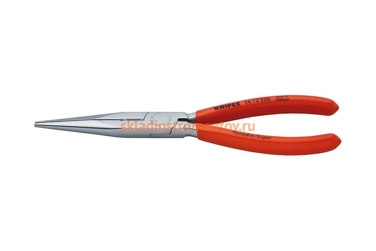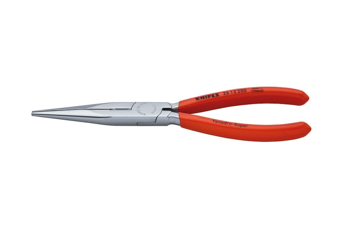 Длинногубцы с резцом KNIPEX KN-2613200 предназначены для выполнения различных монтажных и слесарных работ в труднодоступных местах. Губки имеют заостренную форму и оснащены зубцами для более надежного удержания деталей. Режущие кромки закалены до твердости 61 HRC, что позволяет резать мягкую и твердую проволоку. Головка покрыта хромом, что значительно повышает коррозийную стойкость. Пластмассовые чехлы на рукоятках обеспечивают удобное удержание инструмента в руке.
