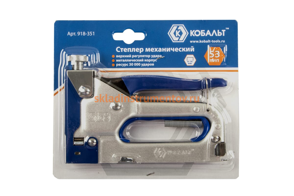 Механический степлер, скобы 4-14 мм, тип 53 КОБАЛЬТ 918-351 прост и удобен в эксплуатации, имеет верхний регулятор удара.