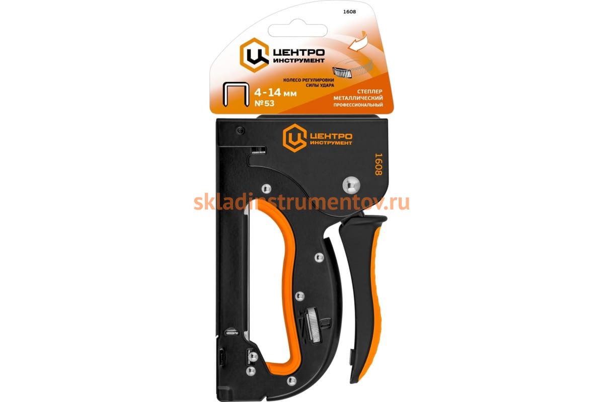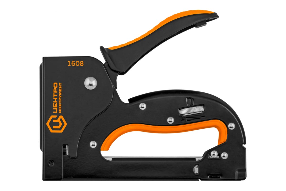 Усиленный металлический степлер Центроинструмент 1608 имеет прочный корпус. Инструмент оснащен удобной рукояткой с прорезиненной накладкой, которая обеспечивает отсутствие скольжения в процессе работы. Инструмент подойдет для соединения тонких деревянных деталей или прибивания материала к деревянной основе.