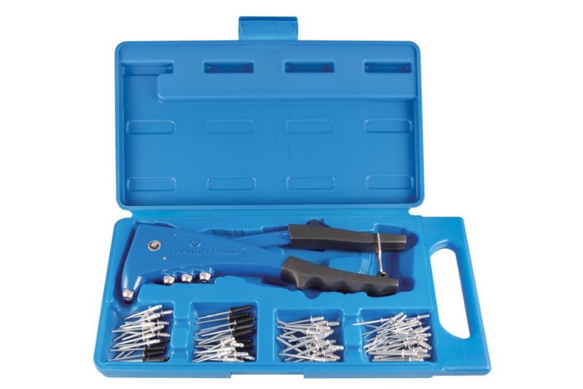 Заклепочник с набором заклепок (20 предметов) KING TONY 21-20-07MR обеспечивает быстрое и простое соединение заготовок из листового металла при помощи вытяжных заклепок. Твердосплавная сталь служит материалом зажимных губок. Модель с оснасткой поставляется в кейсе размером 276х160х46 мм. Для установки заклепок разного размера предусматриваются специальные адаптеры.