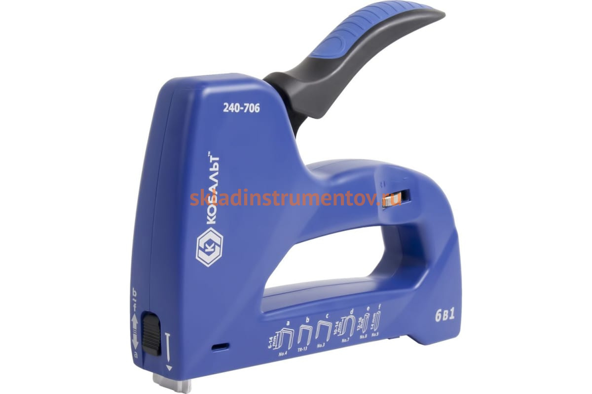 Механический степлер 6 в 1 КОБАЛЬТ 240-706 применяется, в основном, для сборки мебели в бытовых условиях. Корпус выполнен из ударопрочного пластика. Модель работает со скобами типа 13, 53, 140, а также со скобами для кабеля типа 36, гвоздями типа J и шпильками типа n, что обеспечивает универсальность инструмента.