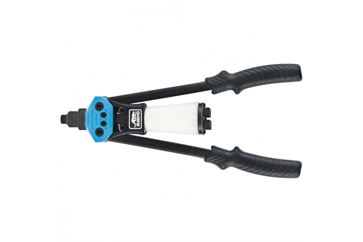 Заклепочник БАРС двуручный 310 мм, алюминий 2,4-6,4 мм, сталь 2,4-4,8 мм 40431 применяется для соединения листового металла, а также металлических профилей и конструкций. Инструмент относится к профессиональному классу.