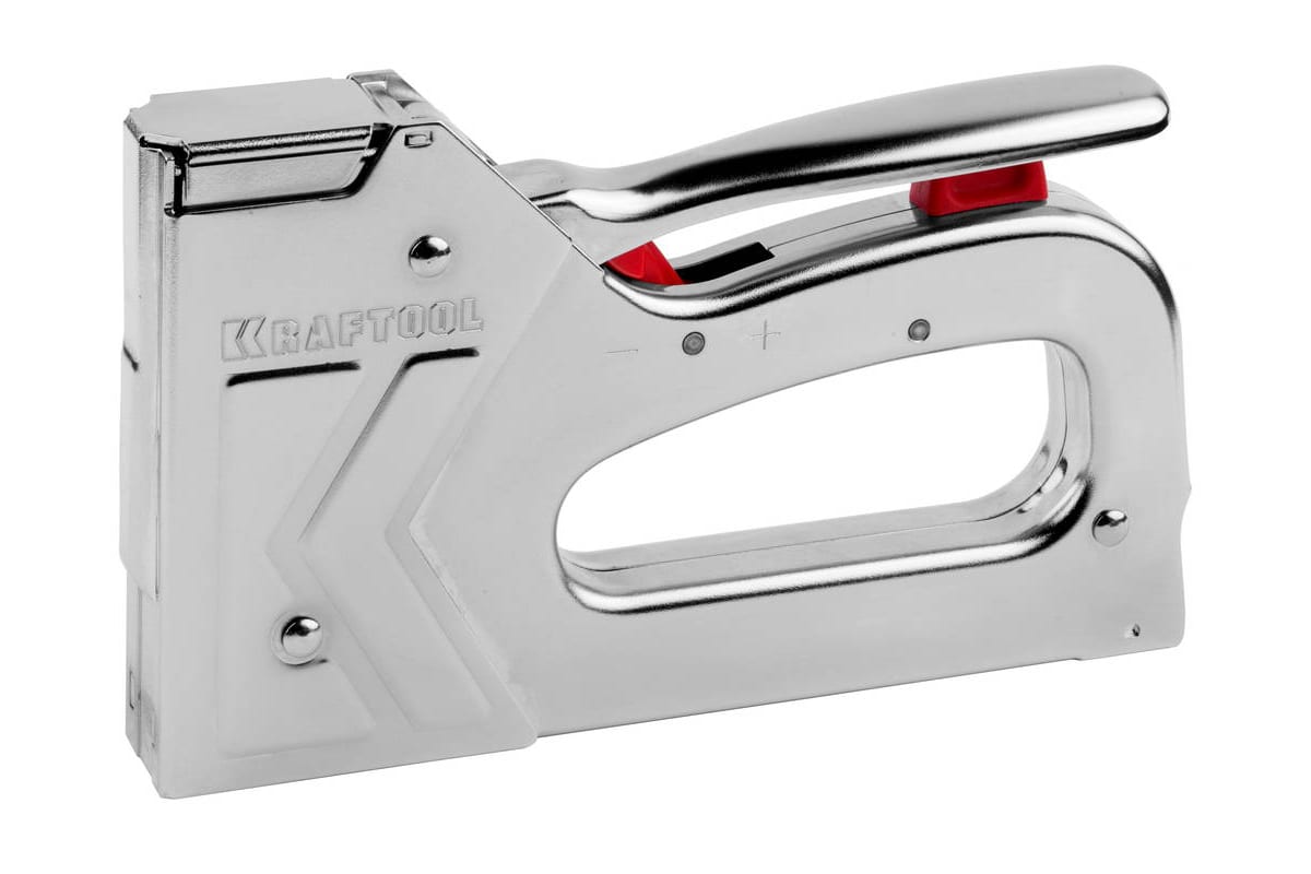 Скобозабивной пистолет KRAFTOOL Hard-53 2-в-1 3180 используется совместно со скобами, гвоздями и штифтами. Его основное назначение - крепление различных материалов (кожи, ткани, пленки) к пластику, дереву, ДВП и т.д. Пистолет обладает усиленной металлической конструкцией, что обеспечивает внушительный рабочий ресурс. Благодаря наличию пластинчатой пружины сила удара увеличивается на 50%.