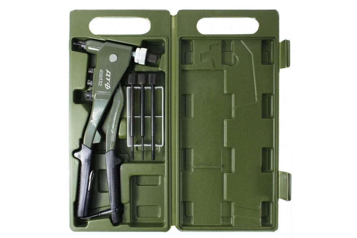Заклепочник для резьбовых заклепок Дело Техники M3-M6 в кейсе 456132 - это простой в применении ручной инструмент, который служит для установки алюминиевых или стальных резьбовых заклепок. Изделие поставляется в кейсе в комплекте с 4 сменными насадками. Прочная конструкция обладает накладками на рукоятках и фиксирующей скобой.