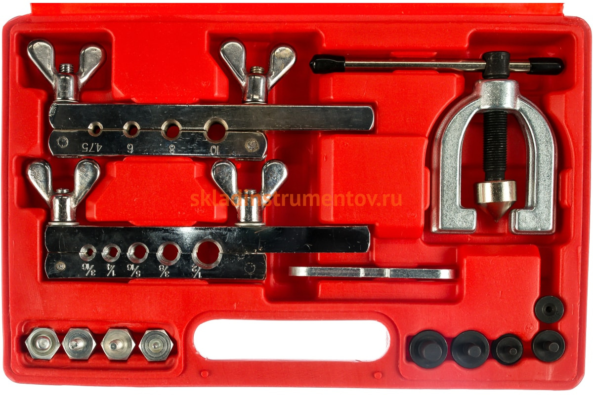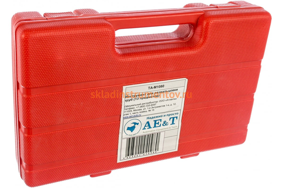 Инструмент для развальцовки труб 13 предметов AE&T TA-M1080 предназначен для изгибания медных и латунных трубок, а также соответствующие адаптеры для формирования двойных раструбов. Данная модель изготовлена из стали марки 45, а литая муфта покрыта хромом. Отличается износостойкостью и прочностью.