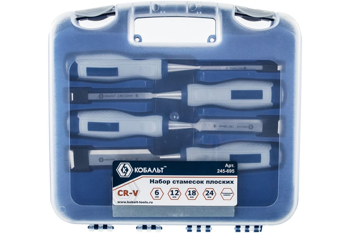 Набор плоских стамесок: 6, 12, 18, 24мм, длина 140мм, CR-V, двухкомпонентные рукоятки, точильный камень, 4шт, кейс КОБАЛЬТ 245-695 служит для работ по дереву - выдалбливания пазов, отверстий, вырезания узоров и пр. Рукоятки из двухкомпонентного материала обеспечивают крепкий хват без скольжения в ладони мастера.