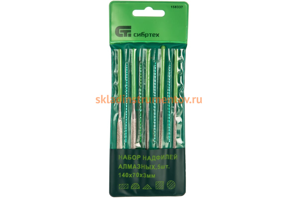 Набор алмазных надфилей 140х70х3, 5шт СИБРТЕХ 158337 активно применяется для выполнения мелких слесарных работ, где необходима обработка заготовок из особо твердых материалов - металла, керамики, стекла и т. п. Надфили имеют напыление из алмазной крошки. Длины рабочих частей равны 7 см. В зоне обхвата предусмотрены удобные ручки из пластмассы.