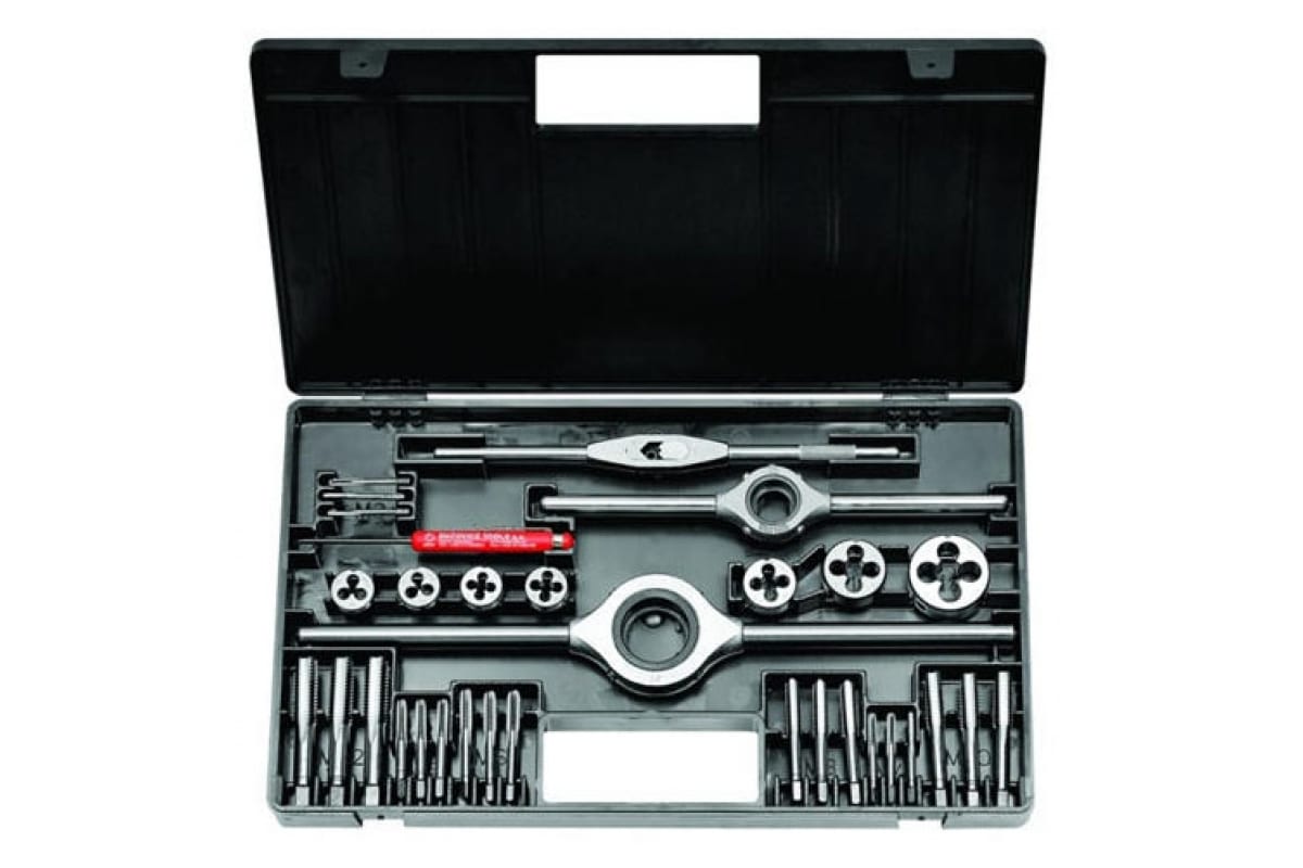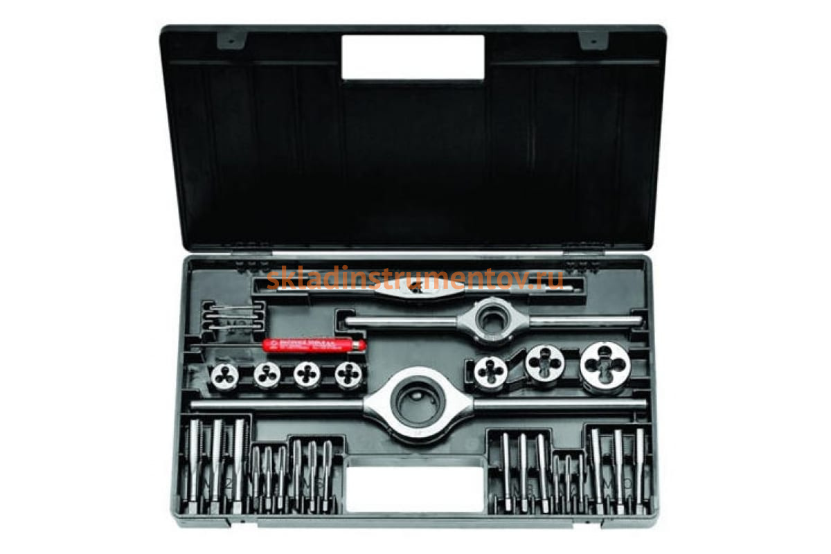В наборе представлен широкий ассортимент метчиков, плашек, держателей и пр.
