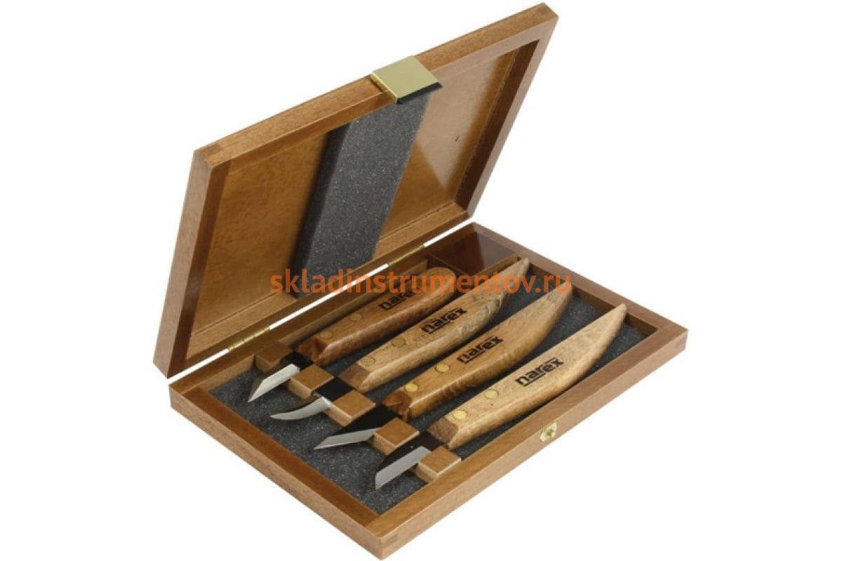 Набор из 4 ножей в деревянной коробке NAREX Profi 869100 - комплект разделочных инструментов для резки древесины. Приспособления отличаются высоким качеством исполнения. Лезвия изделий изготовлены из прочной марганцеванадиевой инструментальной стали и дополнительно термообработаны до твердости 60-62 Hrc. Рукоятки выполнены из экологичного материала - древесины. Поверхность ручек покрыта морилкой и воском.