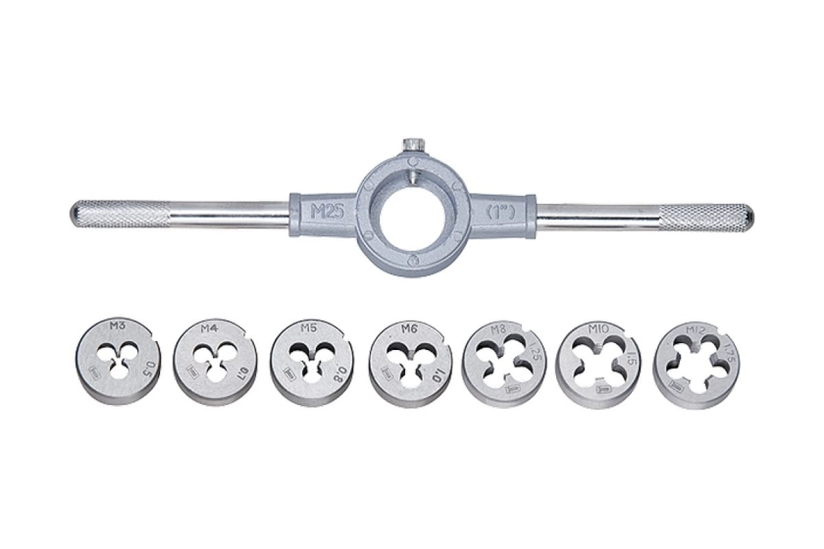 Набор плашек СИБРТЕХ 77309 предназначен для нанесения метрической резьбы с внешней стороны. В комплект входят семь металлических плашек и держатель. Держатель для плашек оснащен рукоятками, что обеспечивает удобную работу инструментом.