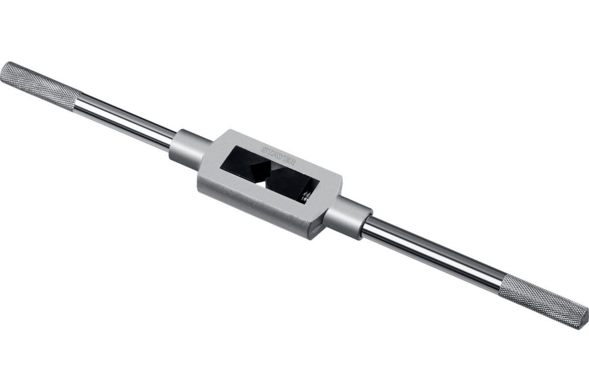 Метчикодержатель Stayer №6, М6-М20, 323мм, Professional 28035-6_z01 имеет стандартную форму с длинными рукоятками. Это позволяет работать с небольшими усилиями и точно выставлять направление вращения.