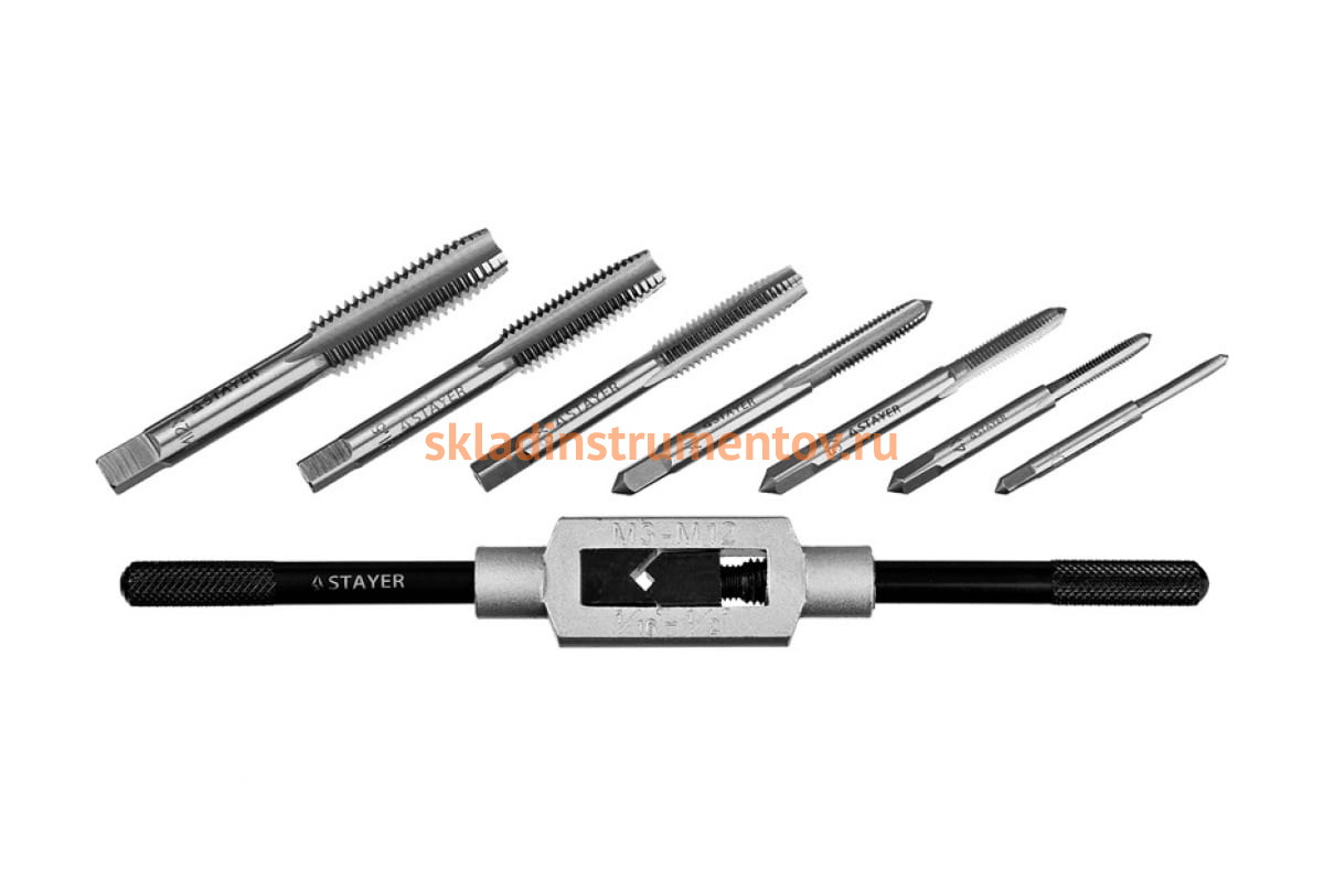 Набор метчиков, метчикодержатель 1шт, метчики 7шт, 8 предметов Stayer MASTER 28016-H8_z01 - комплект из восьми профессиональных инструментов для создания внутренней метрической резьбы. Выполнены из высококачественной стали и обладают высокой прочностью.