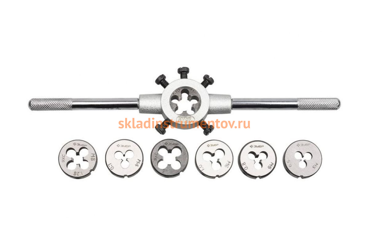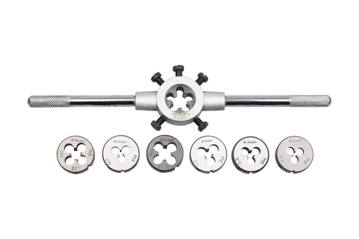 Набор с металлорежущим инструментом 28128-H8 Зубр включает в себя плашкодержатель и плашки различного размера, которые используются при выполнения метрической внешней резьбы в заготовках. Инструмент подходит для работ по таким материалам, как сталь, цветные металлы и т.д. Материал приспособлений сталь высокого качества, предназначенная специально для изготовления подобного инструмента и отличающаяся стойкостью к высоким температурам и ударным нагрузкам. Для удобства использования плашкодержатель оснащен стопорным винтом, а на его ручках имеются насечки.