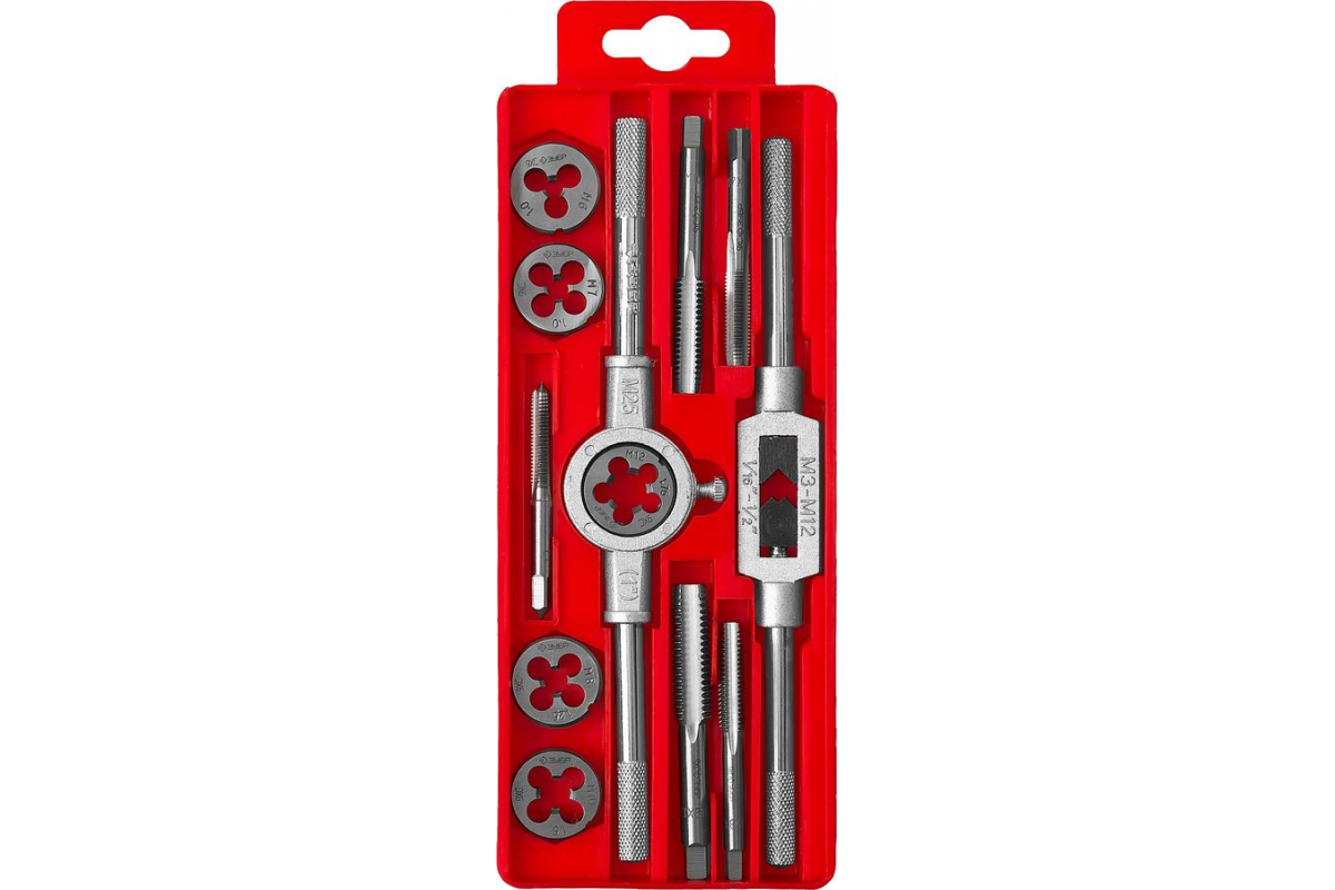 Набор с металлорежущим инструментом 28121-H12 Зубр. Набор включает в себя все необходимые инструменты для нарезания резьбы в заготовках из стали, цветных металлов и т.д. Материал приспособлений сталь высокого качества, предназначенная специально для изготовления подобного инструмента и отличающаяся стойкостью к высоким температурам и ударным нагрузкам. Для удобства использования метчикодержатель имеет механизм для хвостовиков, а на рукоятках метчико- и плашко -держателей имеются насечки для надежной и комфортной фиксации. Удобное хранение инструмента в кейсе из пластика.