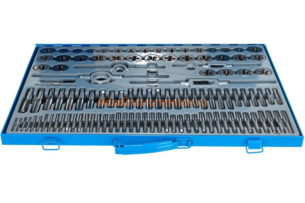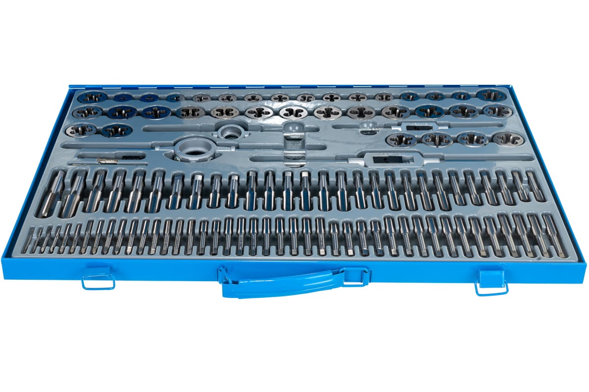 Набор метчиков и плашек "ПРОФЕССИОНАЛ", сталь Р6М5, 110 предметов ЗУБР 28110-H110 включает в себя большое количество резьбонарезного инструмента.