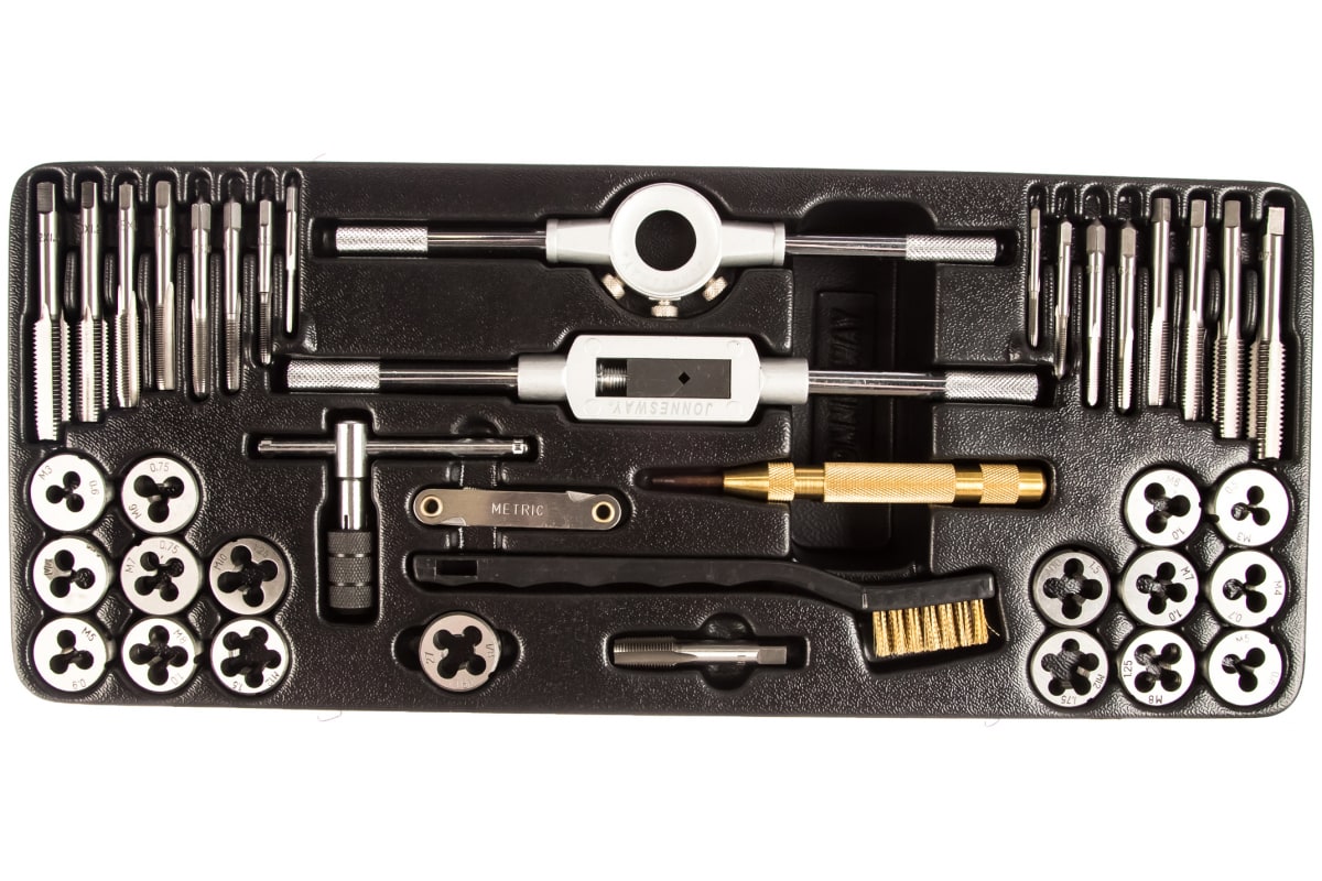 Набор метчиков и плашек с аксессуарами 40 предметов Jonnesway AG10001SP используется для нарезания, а также восстановления поврежденных внутренних и наружных резьб. Комплект состоит из 40 предметов, рабочая часть которых изготовлена из прочной стали, стойкой к механическим воздействиям.Набор поставляется в пластиковом кейсе, что позволяет бережно хранить и транспортировать инструмент.