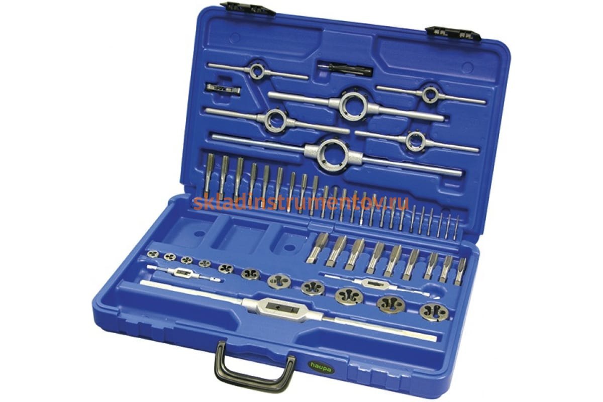 Ассортимент резьбонарезного инструмента из быстрорежущей стали HAUPA 231282 - это комплект для обработки резьбовых поверхностей. Включает в себя плашки и подходящие для них плашкодержатели, метчики и воротки. При изготовлении использовалась быстрорежущая сталь - для долгого срока службы. Для удобства хранения и переноски изделия помещены в специальный кейс, где для каждого инструмента есть своя ячейка.