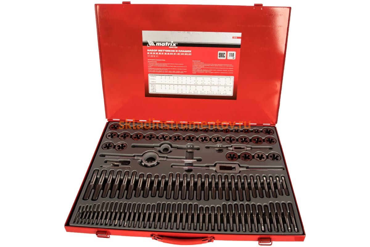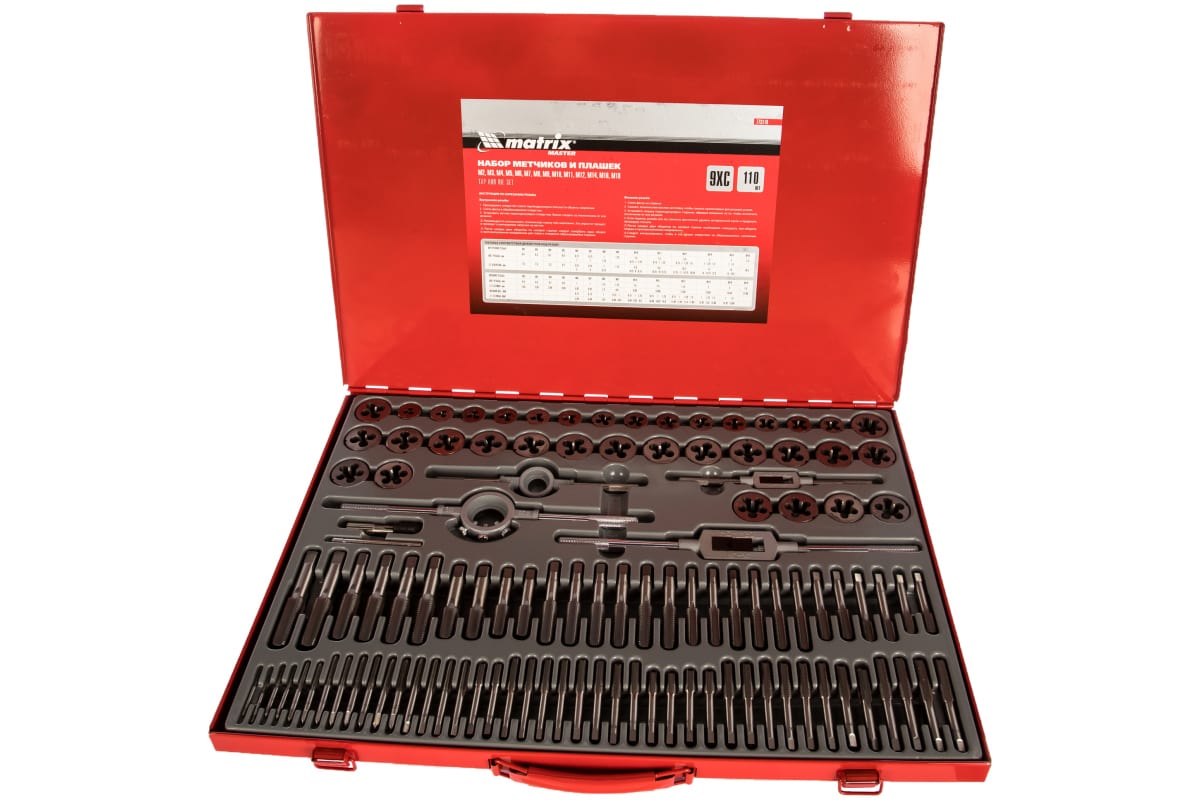 Набор метчиков и плашек Matrix М2-М18 110 шт 773110 применяется для выполнения резьбонарезных работ. Набор поставляется в удобном кейсе оснащенном ложементами для каждого предмета, а крепкая защелка препятствует случайному открыванию и выпадению приспособлений. Все компоненты набора изготовлены из закаленной легированной стали, устойчивой к коррозии.