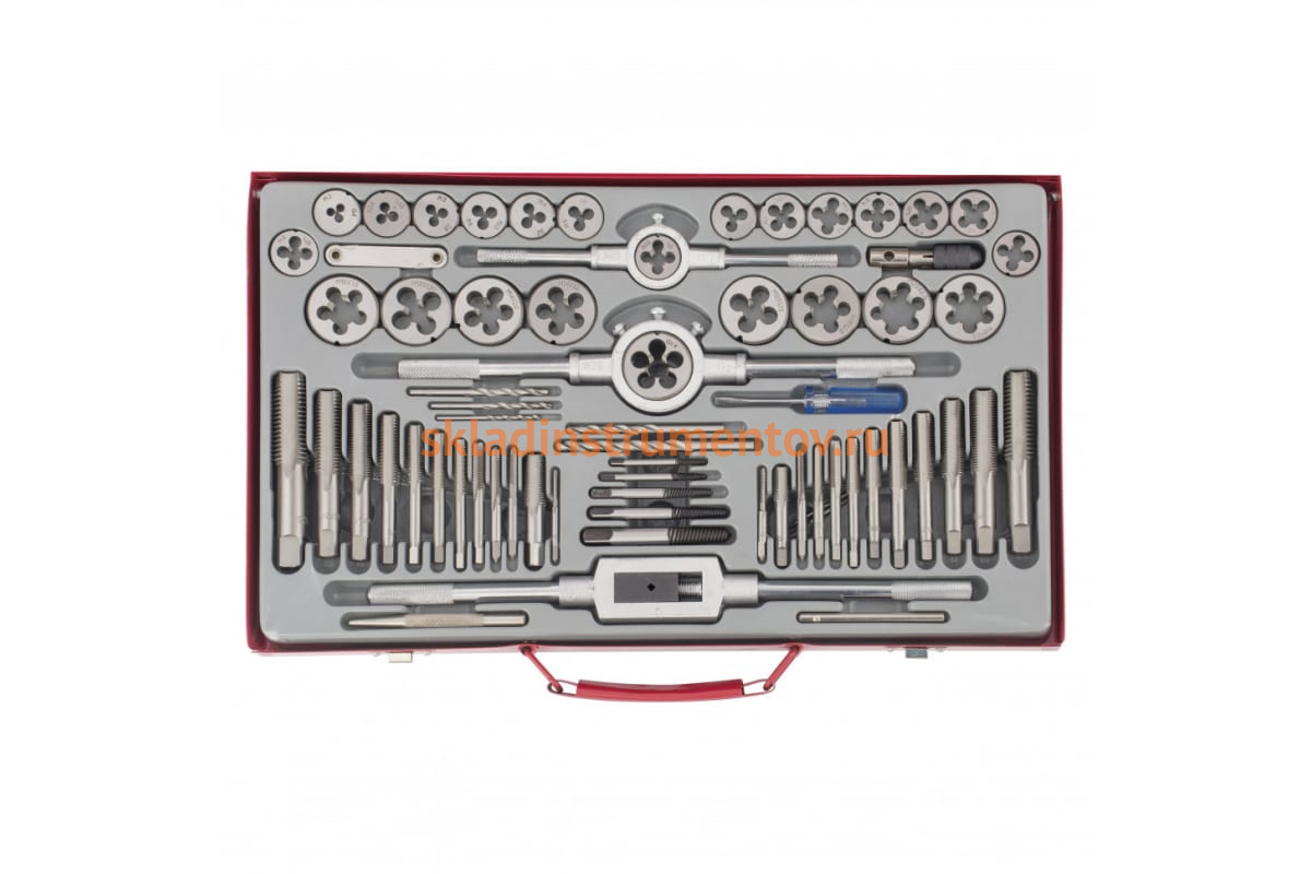 Набор метчиков и плашек Matrix М2-М20, 65 шт 773065 применяется для выполнения резьбонарезных работ. Набор поставляется в удобном кейсе оснащенном ложементами для каждого предмета, а крепкая защелка препятствует случайному открыванию и выпадению приспособлений. Все компоненты набора изготовлены из закаленной легированной стали, устойчивой к коррозии.