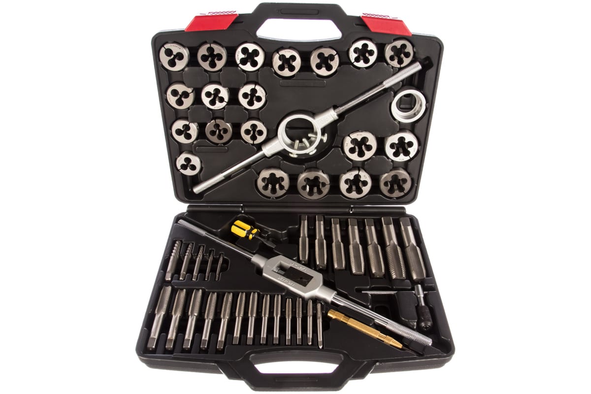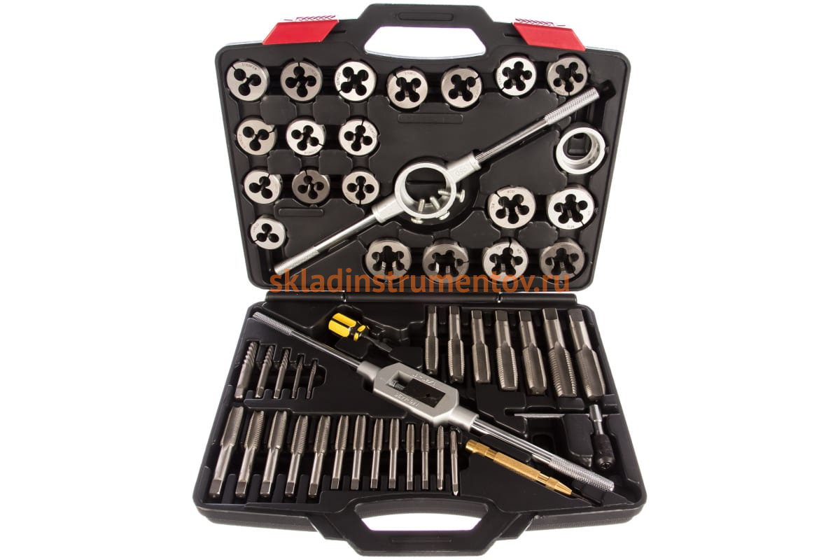 Набор метчиков и плашек МАСТАК SK-5 1/4-1, кейс, 51 предмет 351-10051C представляет собой комплект приспособлений, с помощью которого можно наносить внутреннюю или внешнюю резьбу. Изделия изготовлены из быстрорежущей инструментальной стали SK5. Комплект поставляется в кейсе из пластика.