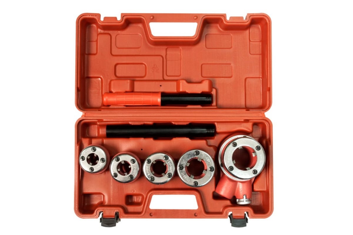 Набор трубных клуппов с адаптером (3/8-1/2-3/4-1- 1 1/4) Энкор 48481 - комплект специализированных приспособлений для нарезания наружной конической резьбы. Пластиковый кейс с ложементами обеспечивает удобство хранения и транспортировки.