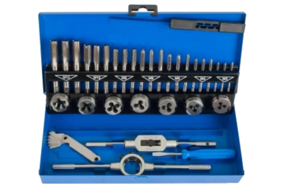 Набор плашек и метчиков (из 32 предметов, М3-М12, металлический кейс) GRIFF 034399 позволяет эффективно нарезать внешнюю и внутреннюю резьбу. Комплект включает в себя инструменты рабочим диаметром от 3 до 12 мм (М3, М4, М5, М6, М8, М10 и М12). Для эффективной работы на станке и вручную имеется вороток.