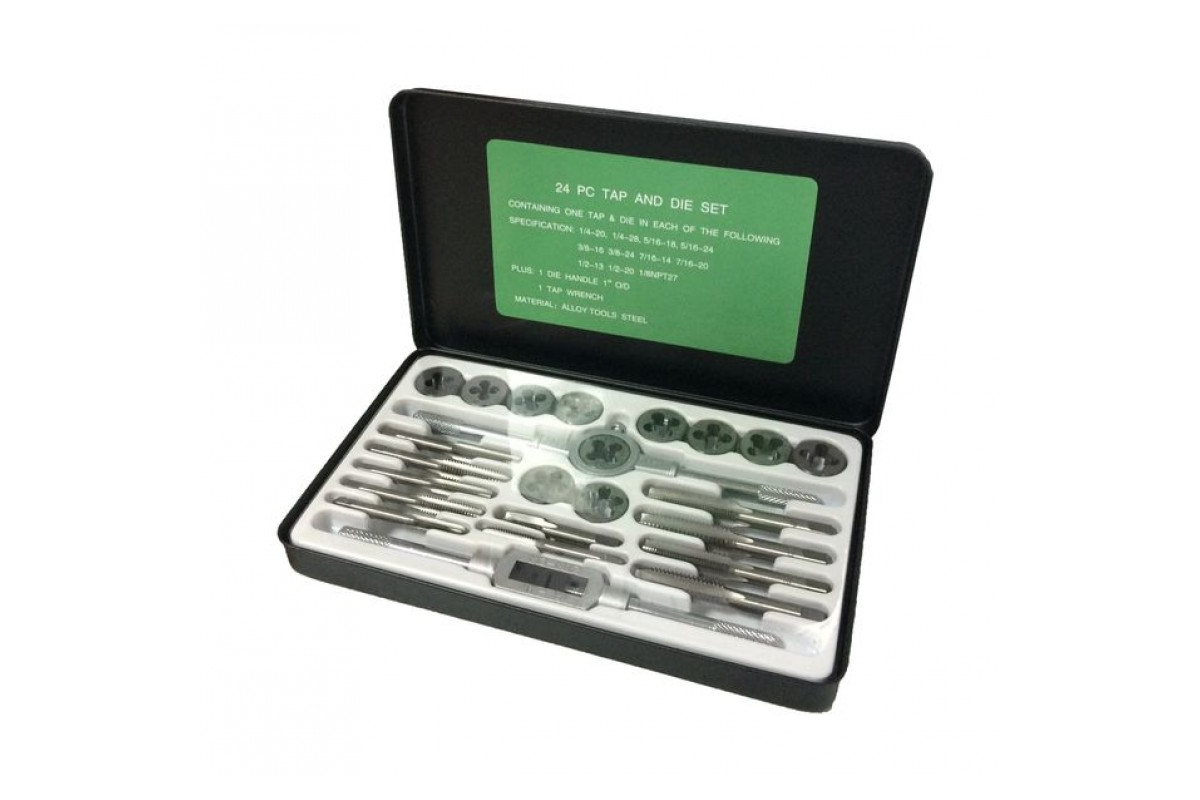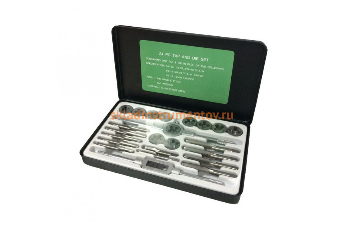 Набор метчиков и плашек ROCKFORCE дюймовый, 24 предмета RF-M024-2 применяется для нарезания резьбы в отверстиях. Инструменты выполнены из прочной стали, отличаются износостойкостью.
