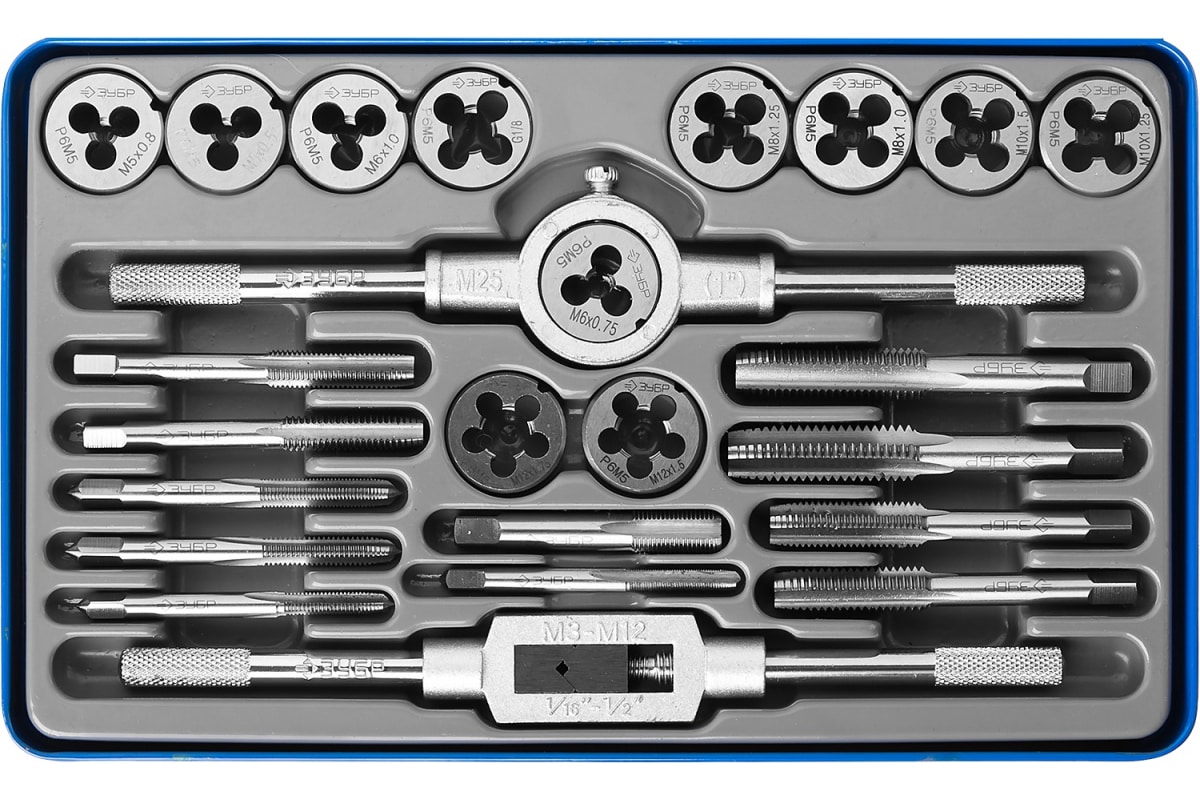 Набор метчиков и плашек, сталь Р6М5, 24 предмета ЗУБР "ПРОФЕССИОНАЛ" 28110-H24 подойдет для работы с цветными металлами и сталями.