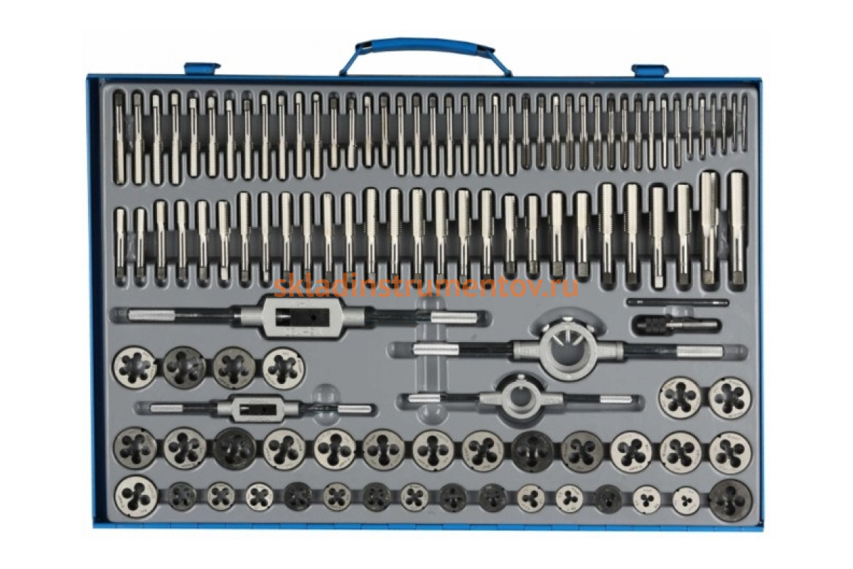 Набор с металлорежущим инструментом ЗУБР 28119-H110 состоит из 110 инструментов, которые применяются при нарезании внутренней резьбы с помощью метчиков и метчикодержателей, а также наружной резьбы при помощи плашек. Подходит для работы с изделиями из цветных металлов и стали.