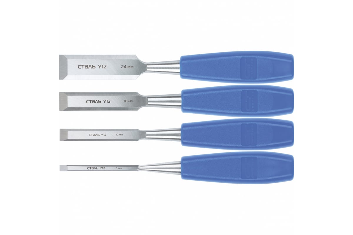 Набор плоских стамесок СИБРТЕХ 4 штуки, 6-12-18-24 мм 24422 обладает рукоятками из ударопрочного пластика. Стамеска - это инструмент для обработки древесины, например выборки и зачистки гнезд или снятия фасок. Плоское полотно инструмента изготовлено из углеродистой стали марки У12. Угол заточки рабочей кромки полотна — 25°. Твердость рабочей части — 57 HRc.
