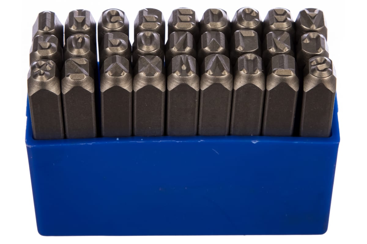 Набор ударных клейм (5 мм, буквы-латиница, 27 предметов) KING TONY 11427SQ05 позволяет делать буквенные оттиски на свинцовых, латунных, дюралевых, железных, медных и алюминиевых поверхностях с целью их маркировки. Метод нанесения обозначений - ударный. Профессиональные приспособления отличаются долгим сроком службы, не скалываются и не проминаются. Материалом клейм служит прочная закаленная легированная инструментальная сталь CrV.