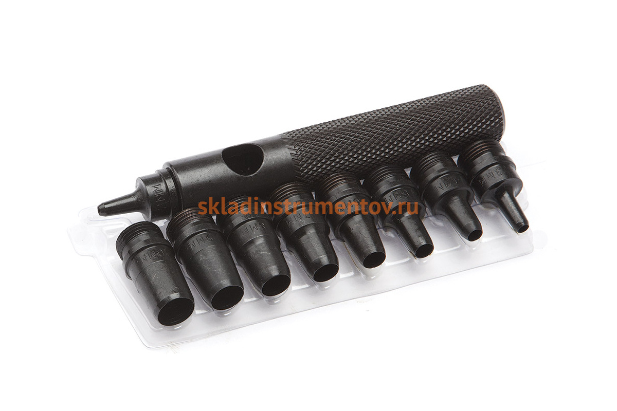 Набор просечек со сменными насадками Дело Техники 10 предметов 2,3,4,5,6,7,8,9,10 мм 50/5 376510 позволяет пробить отверстия в коже и других аналогичных материалах.