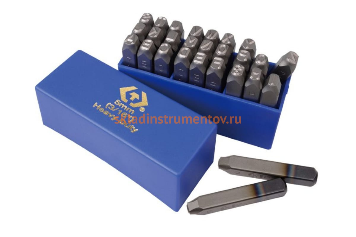 Набор ударных клейм (5 мм, буквы-латиница, 27 предметов, хвостовик HRC 40) KING TONY 11527SQ05 позволяет оставлять оттиски на арматуре и пластинах из дюраля, конструкционной стали, свинца, железа, меди, латуни и алюминия. Сфера применения клейм - маркировка деталей и готовых изделий в строительстве, промышленности, автосервисе. В комплект поставки входит 27 предметов - по количеству букв латинского алфавита. Профиль стержней представляет собой квадрат с гранью 11 мм. Вес комплекта составляет 1.7 кг.