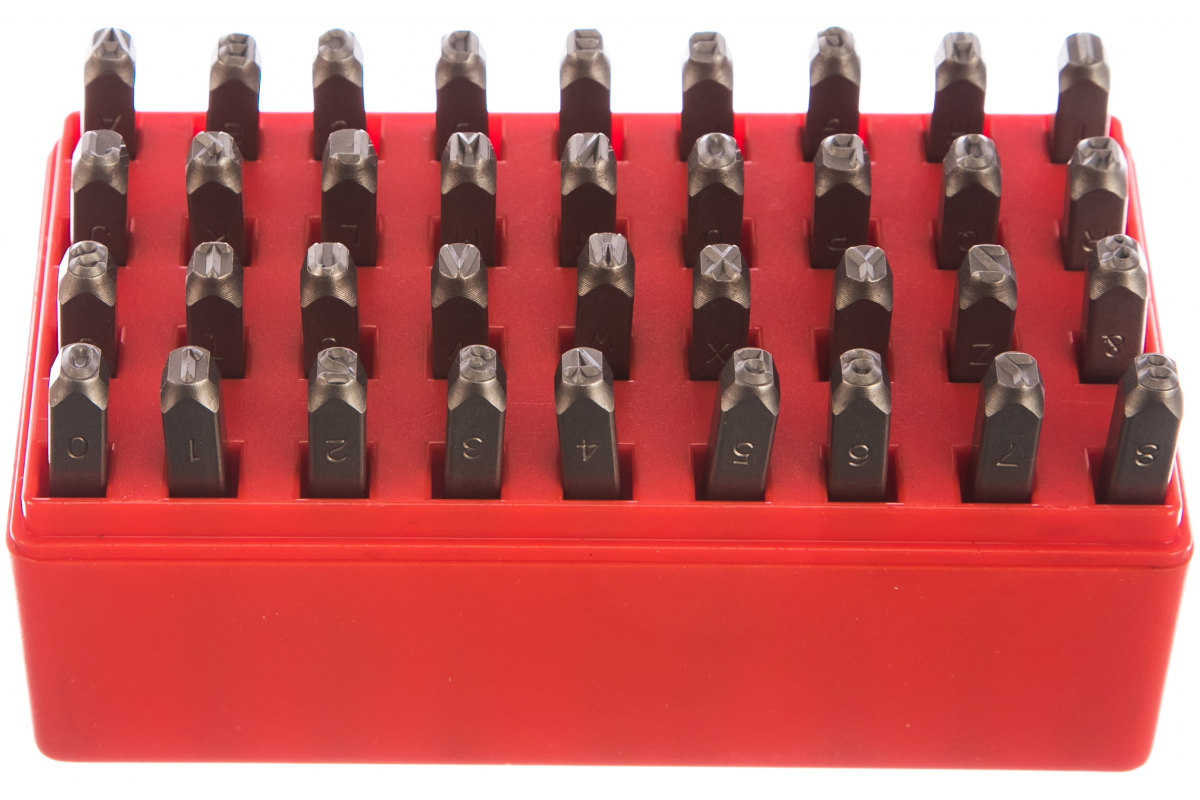 Набор клейм Hans букв и цифр 36 предметов, 6 мм 561501-364 изготовлен из хром-ванадиевого сплава, закаленного токами высокой частоты (индукционная закалка, твердость порядка 52-55 HRC).