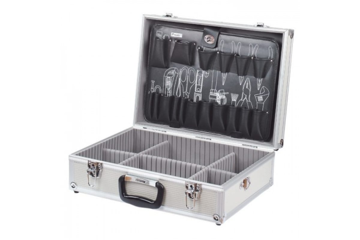 Кейс для инструментов ProsKit 8PK-735N 00173083 оснащен жесткой перегородкой, оборудован надежным ключевым замком, дополнительно усилен алюминиевым каркасом, имеет крышку на трех петлях, а также предусмотрены защитные угловые накладки.