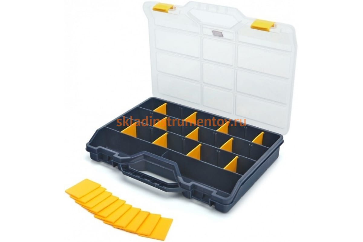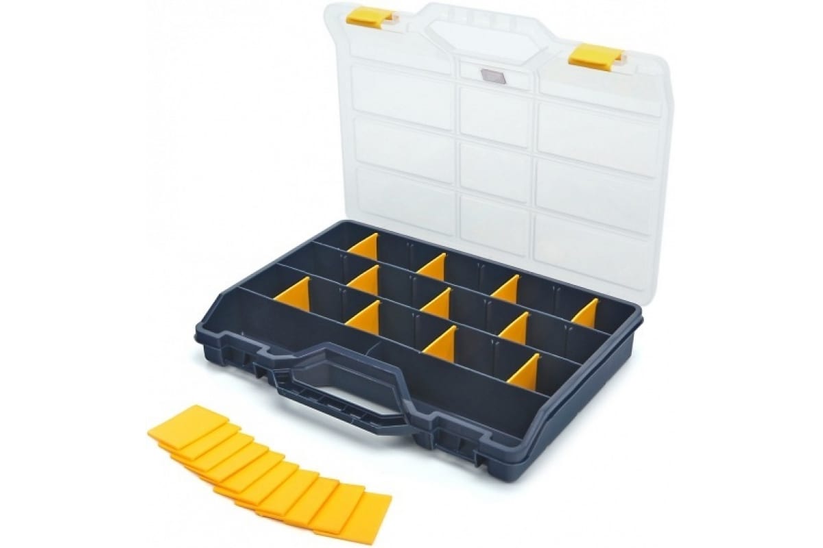 Органайзер со вставками 37.8х29х6.1см №46 Tayg TAY-146008 изготовлен из пластика, имеет удобную конструкцию, оснащен прозрачной крышкой и замками. Легкосъемные желтые перегородки дают возможность регулировать размер ячеек под хранение необходимых приспособлений, деталей, запчастей и прочих мелких предметов.
