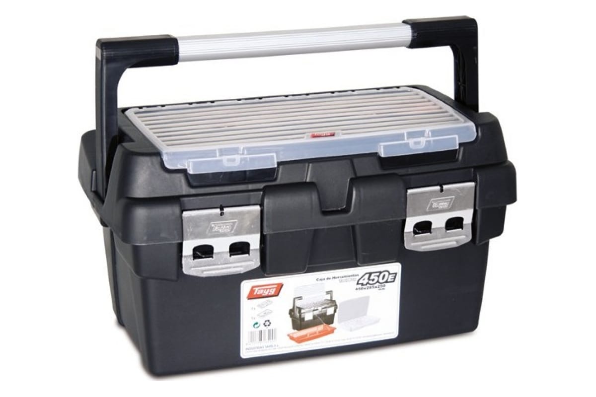 Ящик для инструментов с лотком + органайзер + органайзер в крышке 45х28.5х25см №450Е Tayg TAY-164002 содержит лоток, съемный органайзер для мелочей и встроенный органайзер в крышке. Изделие имеет прочную и удобную алюминиевую ручку и металлические замки.