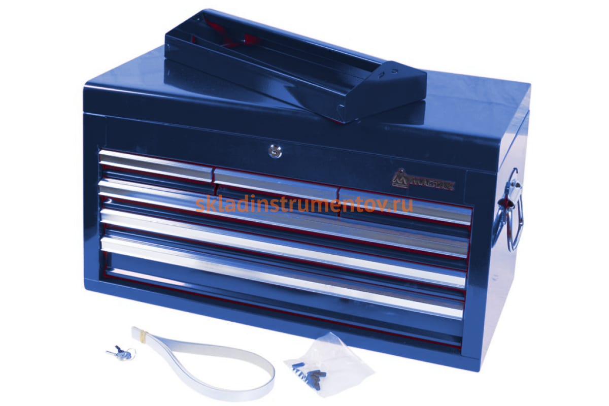 Инструментальный ящик с 6 полками МАСТАК синий 511-06570B предназначен для хранения и переноски ручного инструмента. 6 выдвижных полок обеспечивают организацию инструмента таким образом, чтобы необходимый предмет всегда был под рукой. Для увеличения срока эксплуатации ящик выполнен из стали. Предусмотрен переносной стальной лоток для хранения крепежа. Центральный замок гарантирует сохранность инструмента.