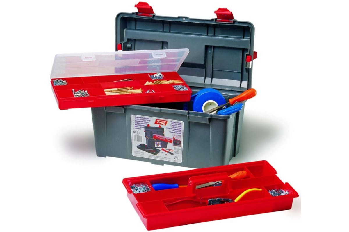 Ящик для инструментов с лотком + органайзер 44.5х23.5х23см №31 Tayg TAY-131004 служит для стационарного хранения и транспортировки всех необходимых для работы любого мастера инструментов и приспособлений. Изделие изготовлено из качественного пластика, имеет крышку и запирается на два замка. Рукоятка обладает возможностью складывания для компактного размещения ящика на полке, в шкафу или багажном отделении автомобиля.